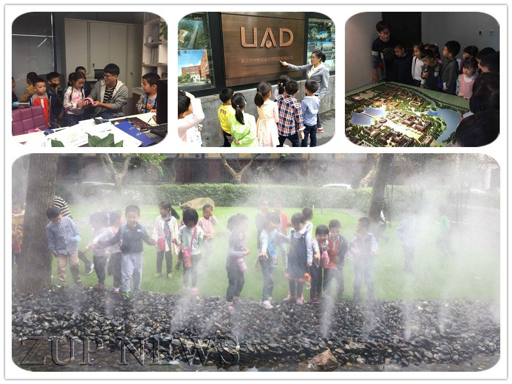 孩子们兴高采烈地来到浙江大学建筑设计院。首先,吸引孩子眼球的是一片雾蒙蒙的“喷雾”,孩子们走进喷雾和喷雾一起做游戏。在游戏的过程中,对“喷雾”产生了一些疑问,这些雾是怎么喷出来的?有的孩子蹲下来进行了研究;水池中间圆盘的作用是什么?孩子们提出疑问由设计人员进行讲解,通过讲解孩子们了解到了“喷雾”的原理和作用。随后,孩子们跟随设计人员走进大楼参观设计院内部构造,五个班级进行分区参观,在大厅孩子们看到各种建筑模型和奖杯。接着走进每层楼进行参观,每层楼都有很多科室,孩子们走进每个科室大胆地与叔叔阿姨交流一些有关建筑的问题,如:设计楼房都要做些什么呢?为什么好多房子有电梯,而有些房子没有呢?等,叔叔阿姨为孩子进行一一解答。最后,孩子们来到报告厅,观看PPT——趣味的建筑,小杭妈妈准备了丰富的图片,由古代到现代再到未来、由国内到国外的各种图片供幼儿进行欣赏。什么是建筑?你认识这些国内外有名的建筑物吗?你觉得未来的建筑是什么样的?通过交流互动的方式把这次活动推向了高潮,活动结束后孩子们还沉浸在各种建筑物的形状上,我喜欢那个蜗牛式的房子;我喜欢悉尼歌剧院的贝壳形状;我喜欢在海上建造的房子,感觉海上的房子好神奇哦!