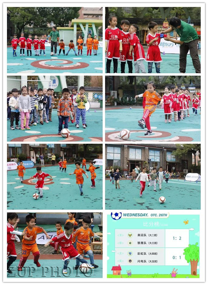 当天的比赛分成上、下午两场。早上10点20分,对战双方是奥运队大2班和 雏鹰队大3班。比赛一开始,两个队的小球员都很兴奋,在中场把皮球踢得你来我往,但可能是第一次踢正式比赛的缘故吧,谁都没有占到便宜。在一次雏鹰队的进攻中,皮球被奥运队抢下,但是慌乱中出错,一脚没踢正,皮球被踢入了自家球门,帮对手踢入了本次联赛的第一粒进球。自摆乌龙后,我们奥运队的球员并不气馁,在多次破门良机后,终于在彭于晏晃过对方防守球员后,一脚捅射,扳平比分,把双方拉回到同一起跑线!比分被扳平后,雏鹰队的球员控制住球员,并趁对方全力压上之后后方空虚的机会,三传两倒,把皮球传入了对方网窝,再次超出比分!之后的比赛,双方再无建树!雏鹰队2:1获胜!常规赛之后,激动人心的点球赛接踵而至,一个个都攥在小拳头发誓要为本班踢进点球。最终,奥运队点球17位小朋友踢进了13个,老鹰队18位小朋友踢进15个,老鹰队继续获胜!虽然奥运队今天的比赛输了,但是整体团结,乐毅哥哥相信,在之后的比赛里,他们将后来者居上,取得一个好的成绩。