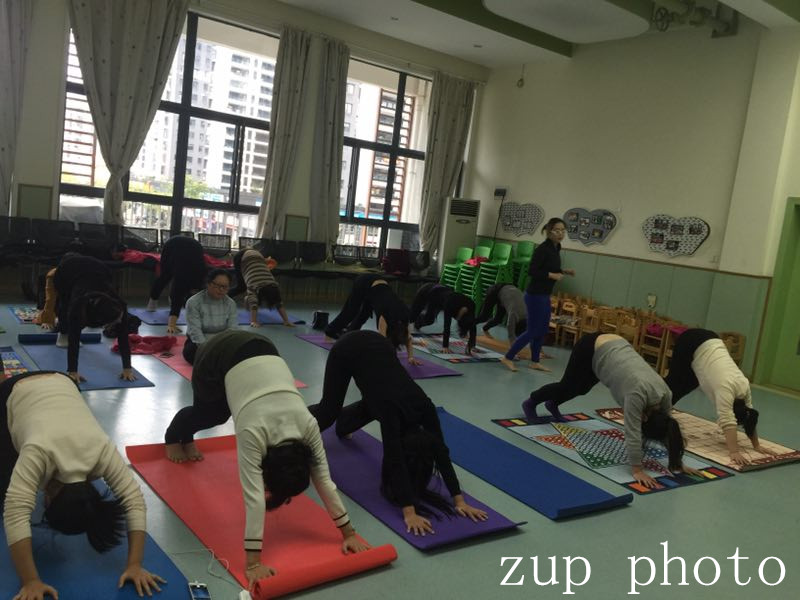 瞧,老师们在瑜伽老师的指导下,很快经沉浸在瑜伽的世界中了,随着一声声有节奏的“呼”、“吸”,感觉自己身上的每一寸肌肉、每一条韧带都在不断地延伸,每一个细胞都活动开了。那一刻,老师们忘却了所有的压力,烦恼,只有身体,心灵与精神和谐统一。