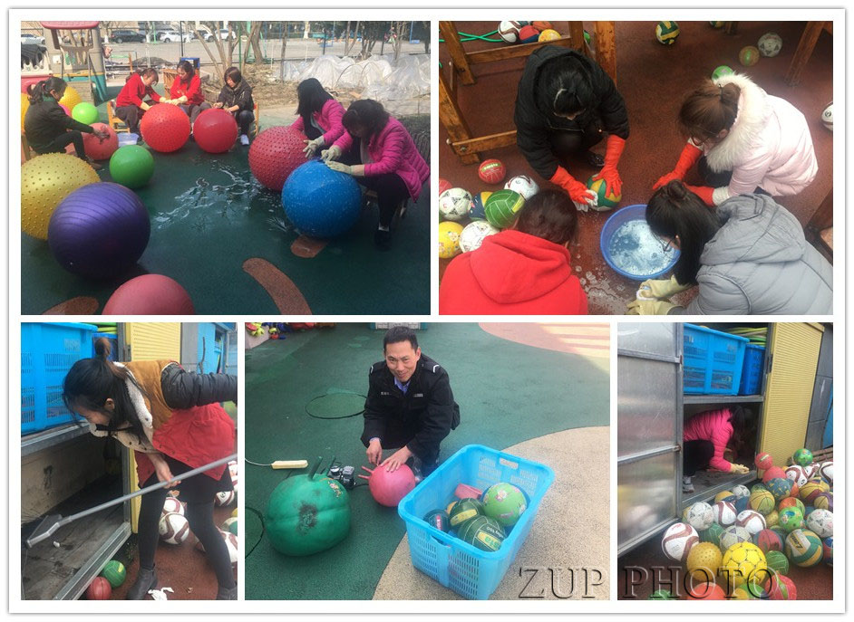 分配完任务后,每个成员深入到“玩具总部”,把所有的玩具都从“家里”请出来洗澡,用毛巾给每一个玩具擦擦干净,让他们晒晒太阳。不仅给每个玩具进行“沐浴”,大家还清洗了玩具的家。每个人都卷起袖子埋头清洗,大家围在一起清洗玩具球,钻进玩具收放处清理,为“受伤”的玩具修修补补的,拿起长长的水管冲水的……也许,脚上的鞋子湿了,也许手有点酸了,但听到大家嘴里说的是:孩子们下午就可以玩这些干净的玩具啦。这一刻,大家的用心真的都很美!