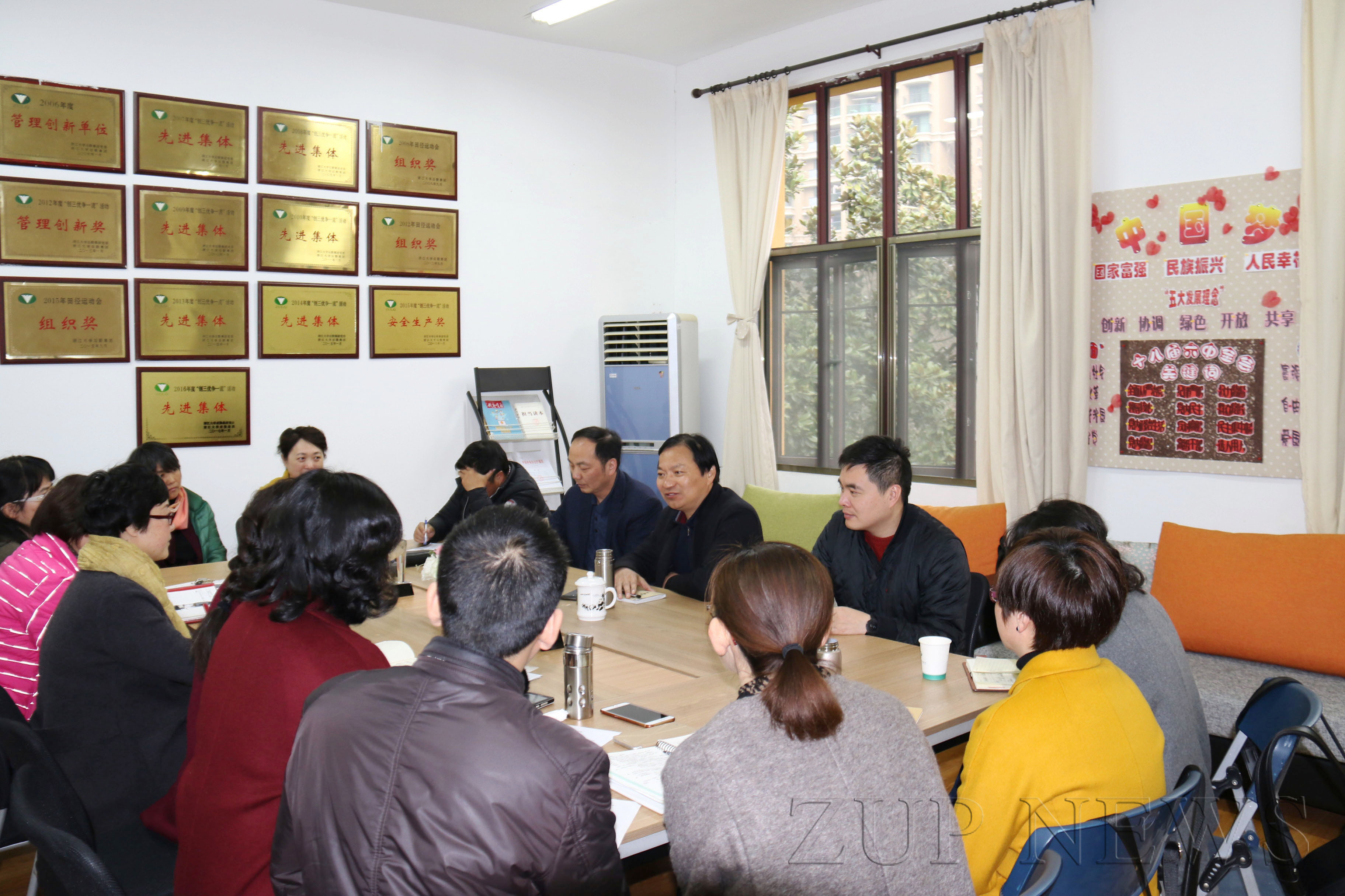 张谷乐主任代表中心对后勤集团领导班子莅临中心指导工作表示感谢,并就新学期园区开学情况作了汇报。2017年幼教中心将始终按照集团和中心整体的发展思路开展各项工作,扎实稳进,从而推动幼教工作的新发展。随后,后勤集团领导班子针对当前幼教行业的发展形势,就幼教中心今后的发展思路和与会人员进行了探讨,并提出了可行的意见和建议。期间,控股集团总裁胡征宇也抽会议间隙到幼教中心指导工作,对幼教中心新一轮的发展寄予厚望。