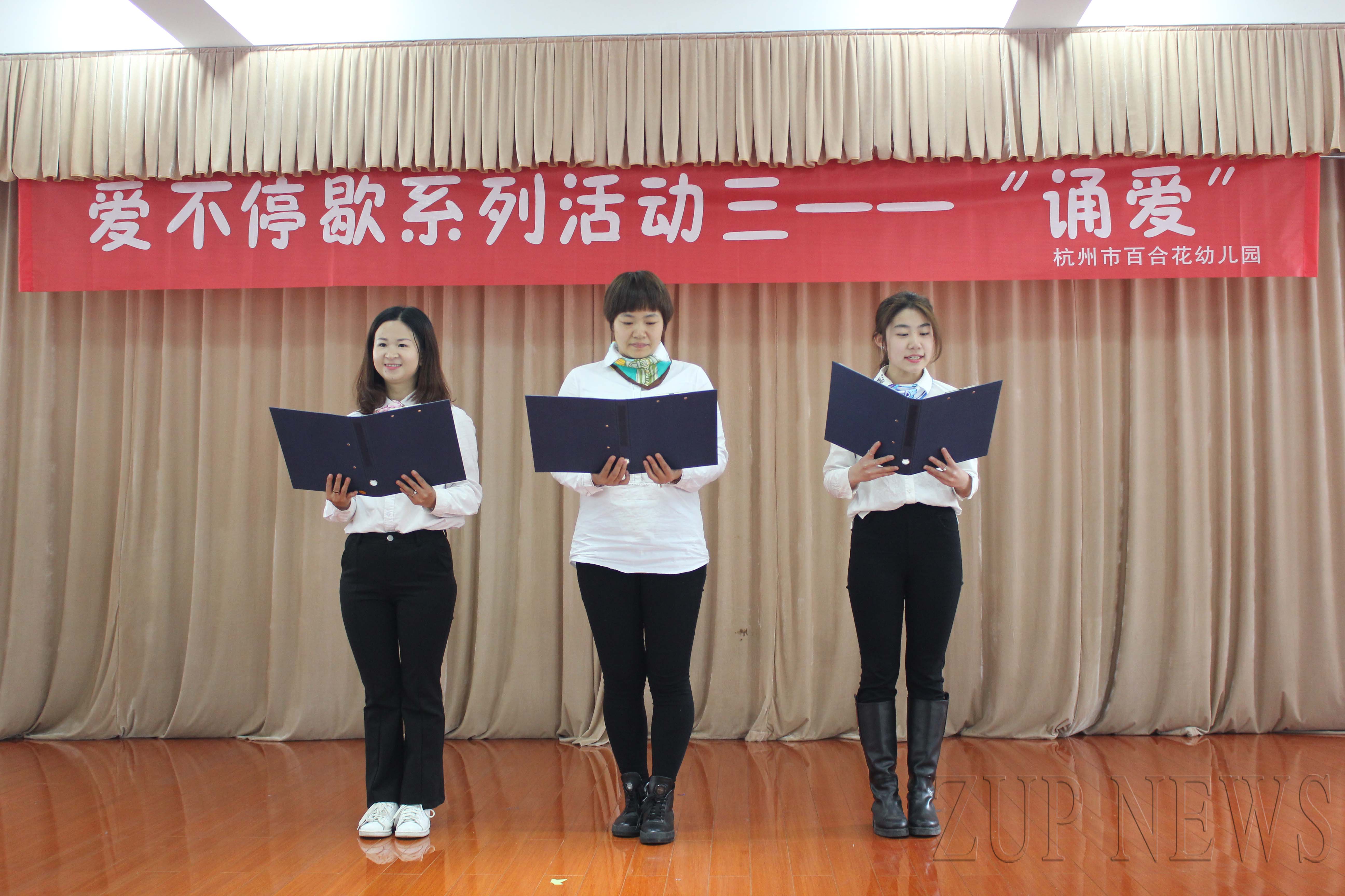 在前不久刚刚落下帷幕的《诗词大会》至今一直热度不减,你是否也为中国诗词的魅力所折服,为主持人董卿在现场诗词歌赋信手拈来所惊叹。借此,3月3日下午,杭州市百合花幼儿园的全体教职工汇聚一起,以班级为单位,变身朗读者,开展“爱不停歇系列活动三——诵·爱”诗歌朗诵暨庆三八活动。