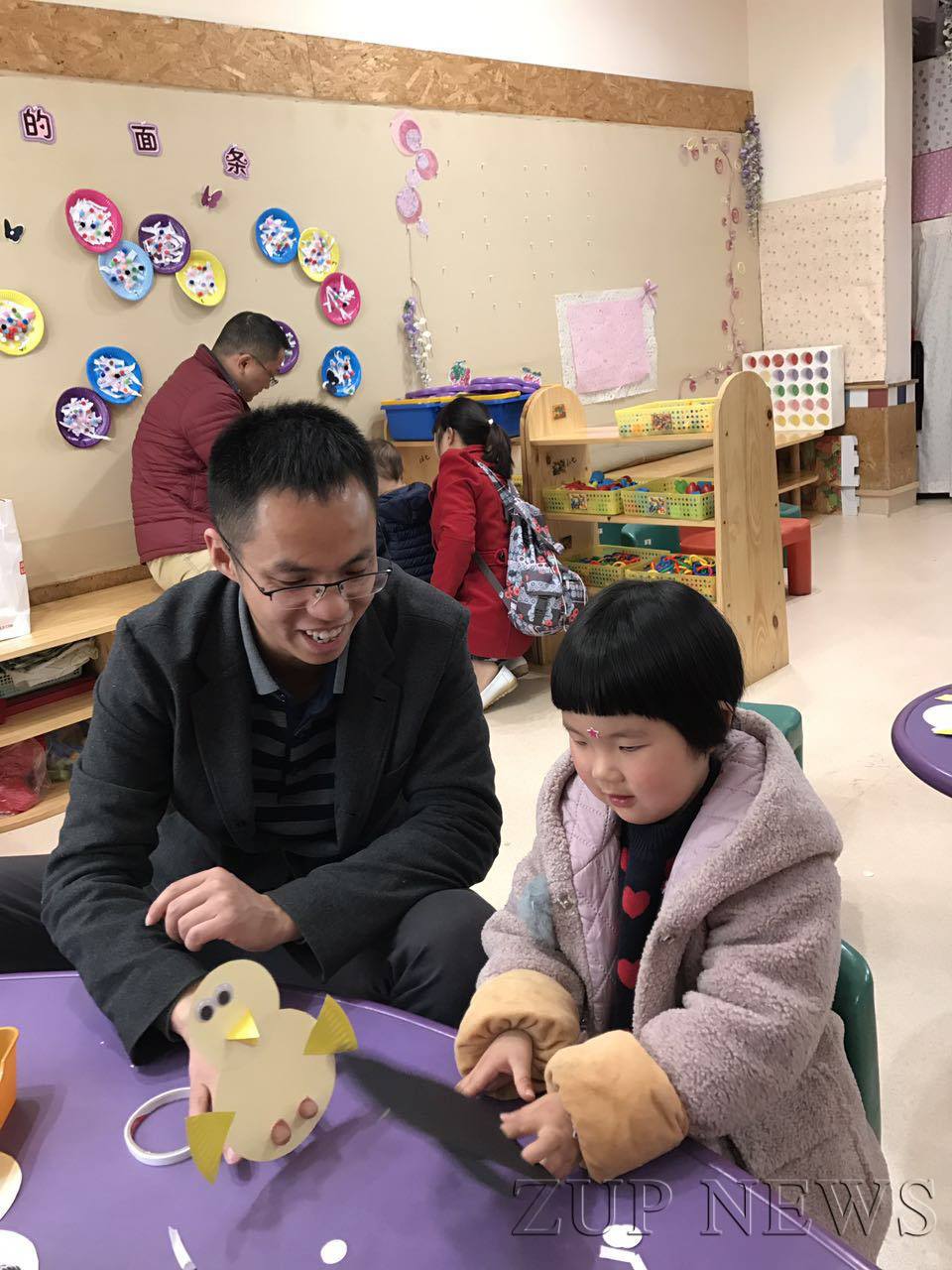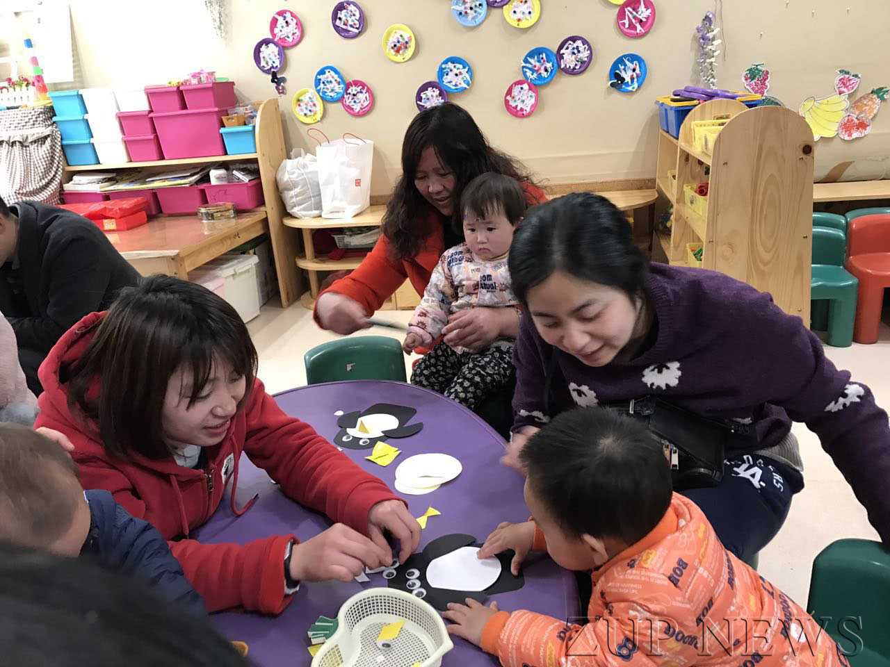 在简单的生活环节和短暂的休息过后,是锻炼手部小肌肉的美工活动。李闻荪老师进行了详细的讲解,小朋友们在爸爸妈妈和老师的帮助下尝试用固体胶来粘贴,变出一只只可爱的小鸡和小企鹅,带着小鸡和小企鹅回家去,又多了两个好朋友!