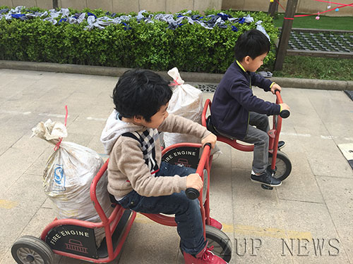 正在这时,运输队的小朋友骑着三轮车、拉着平板车来了,大家一起把一桶桶泥土搬到小车上,小司机出发啦!小司机们手握车把,脚下生风,来来回回穿梭在幼儿园里,连保安叔叔搬起来都吃力的一袋袋新泥,他们踩着车骨碌骨碌就运走了,脸上洋溢着自豪的神情。