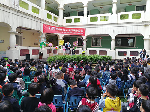接下来是老师们精心编排的手偶剧《和甘伯伯去游河》,老师们在幕布后举着手偶奋力地表演,有趣而又形象地为孩子们讲述了一个人与人、人与动物之间充满理解与宽容的故事,在场的孩子们跟随老师的表演全情投入了故事的情节中,演到滑稽的地方,大家跟着开怀大笑,现场气氛轻松又欢快。