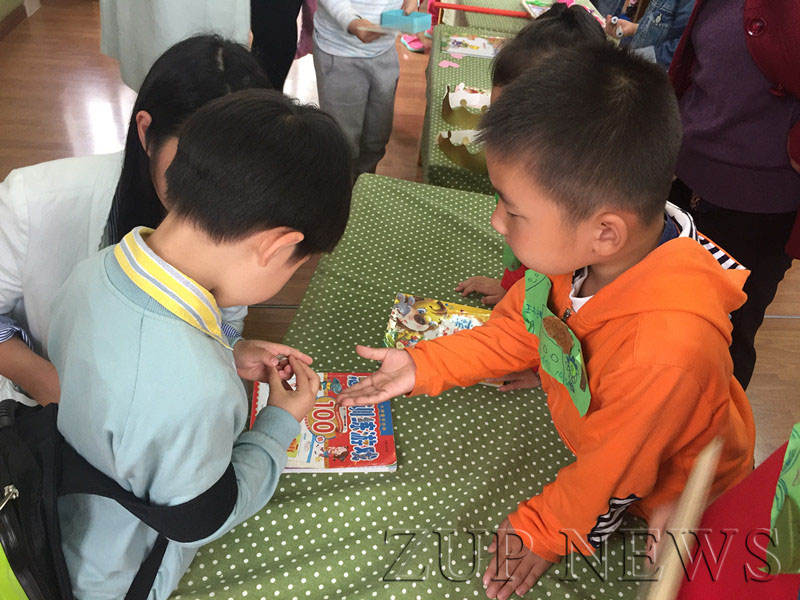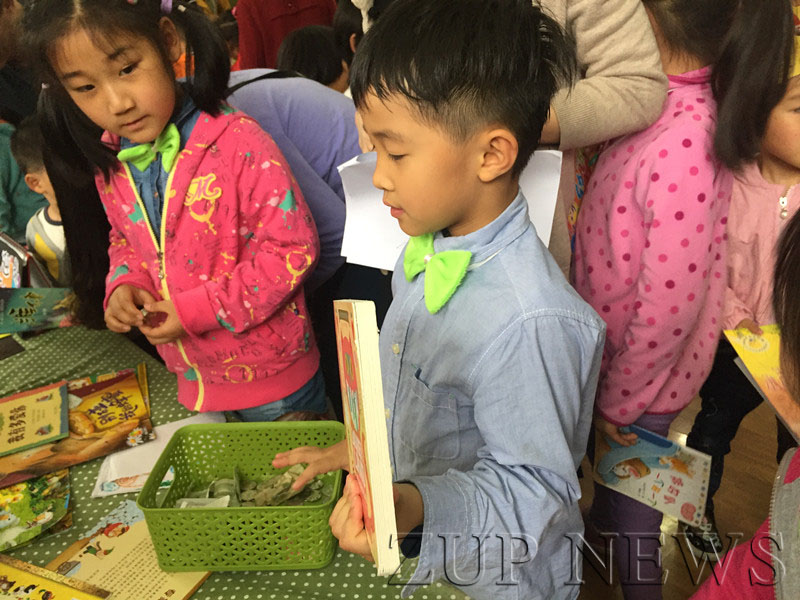 各个摊位整齐有序,叫卖声此起彼伏,别看摊主们年纪小,算起帐来也是条理清楚,“这本书多少钱?”“十块钱!”“能不能便宜一点?”“可以,便宜点,八块吧!”于是小弟弟拿出十块钱给小老板,“你还要找我们钱的?”一旁的奶奶着急的说。小老板拿着钱思索着,过了一会从自己的钱包里掏出了两块钱的硬币,一场以钱购物的交易完成了。再看旁边一位小男生拿着自己的图书,看着面前的一本恐龙世界,小声地说着:“姐姐,我可以和你换书吗?”小摊主非常干脆的说着:“可以啊,我看看你有什么书?”小摊主挑选了一本爱莎公主的贴纸书,一次以书换书的交易也成功啦!