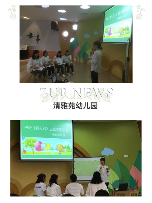 清雅苑老师们从主题目标、主题调整、主题行进脉络、主题实施回顾、后续的调整五大环节为我们现场展示了中班《春天到》主题中期研读,例如在园开展适合幼儿经验的集体教学活动,并结合家园活动、日常观察等自主活动,教师注重幼儿情感的满足,注重幼儿亲身体验感受,在过程中发现不足并按实际情况调整。清雅苑老师们向我们展示了主题活动的开展首先肯定需要一个预设,再是生成一些活动,这就需要教师结合幼儿实际、结合身边资源、关注幼儿原有经验,从而形成主题活动的园本化、班本化。