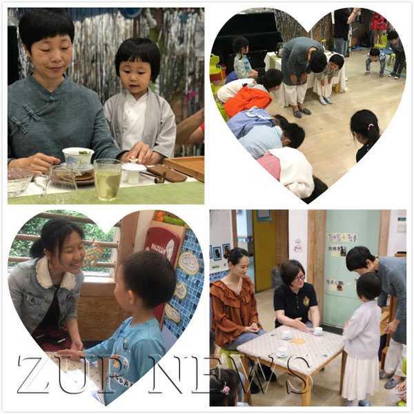 然然和妈妈讲解示范了“敬茶接茶”的礼仪细节,在妈妈的帮助下然然给三位老师敬茶,行了“鞠躬礼”、“手掌礼”。孩子们直观地感受到在中国博大精深的“茶文化”中蕴含的道德礼仪文化。最后,家长义工配合然然妈妈,以小组活动的形式,让每一个孩子都进行了体验。