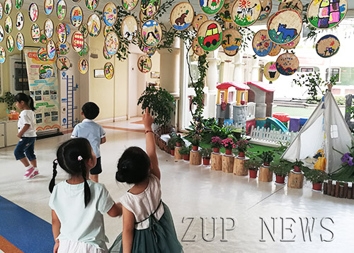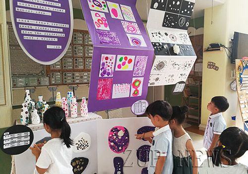园区里经过老师和孩子们的精心布置,处处透露着儿童节的欢快气氛。大厅里悬挂着中班小朋友在艺术节绘画展上创作的五彩缤纷的小圆匾,高高低低,错落有致。两边还有大班、托小班小朋友创作的石头画、点点画。孩子们充分发挥想象,用他们稚嫩的双手,利用各种各样新奇的材料,描绘出了他们眼中绚烂又奇妙的世界。