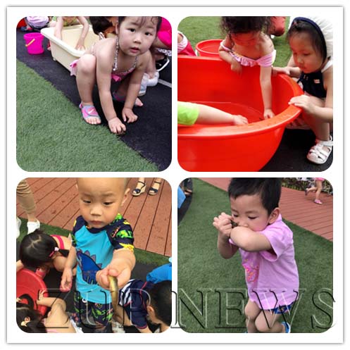 既然“欢畅嬉水”当然少不了水枪大战,大班的孩子和老师们个个装备齐全,战术明确,双方对垒,抢取红旗。在一种对垒的水枪大战中,激情投入,欢畅嬉水。中班的“嬉水”则有所不同,采用的是游园的形式,设置了“激情踏浪”、“滴水不漏”、“我是消防员”以及“有趣的泡泡”四个游戏内容,孩子们自由选择,欢畅淋漓,孩子们直呼“太好玩啦!”小班孩子们除了水枪大战外,还利用了各种材料发现了“水的奥秘”,用瓶子、海绵、漏网等工具接水、灌水,感受水在不同工具下呈现的形态。托班的宝贝们也是幸福满满的过上了集体生日会,穿上美美的泳装,走个秀吧!