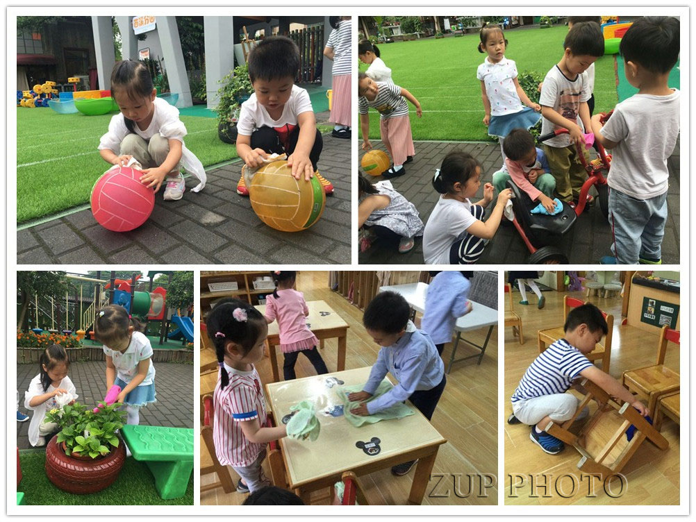 看,有的宝贝正在给我们的大型玩具“洗澡”呢,搓一搓,擦一擦,角角落落不放过。还有的宝贝为了把大型玩具洗的更加的干净,爬到上面清洗,真的超级卖力,俨然一个小小清洁工。