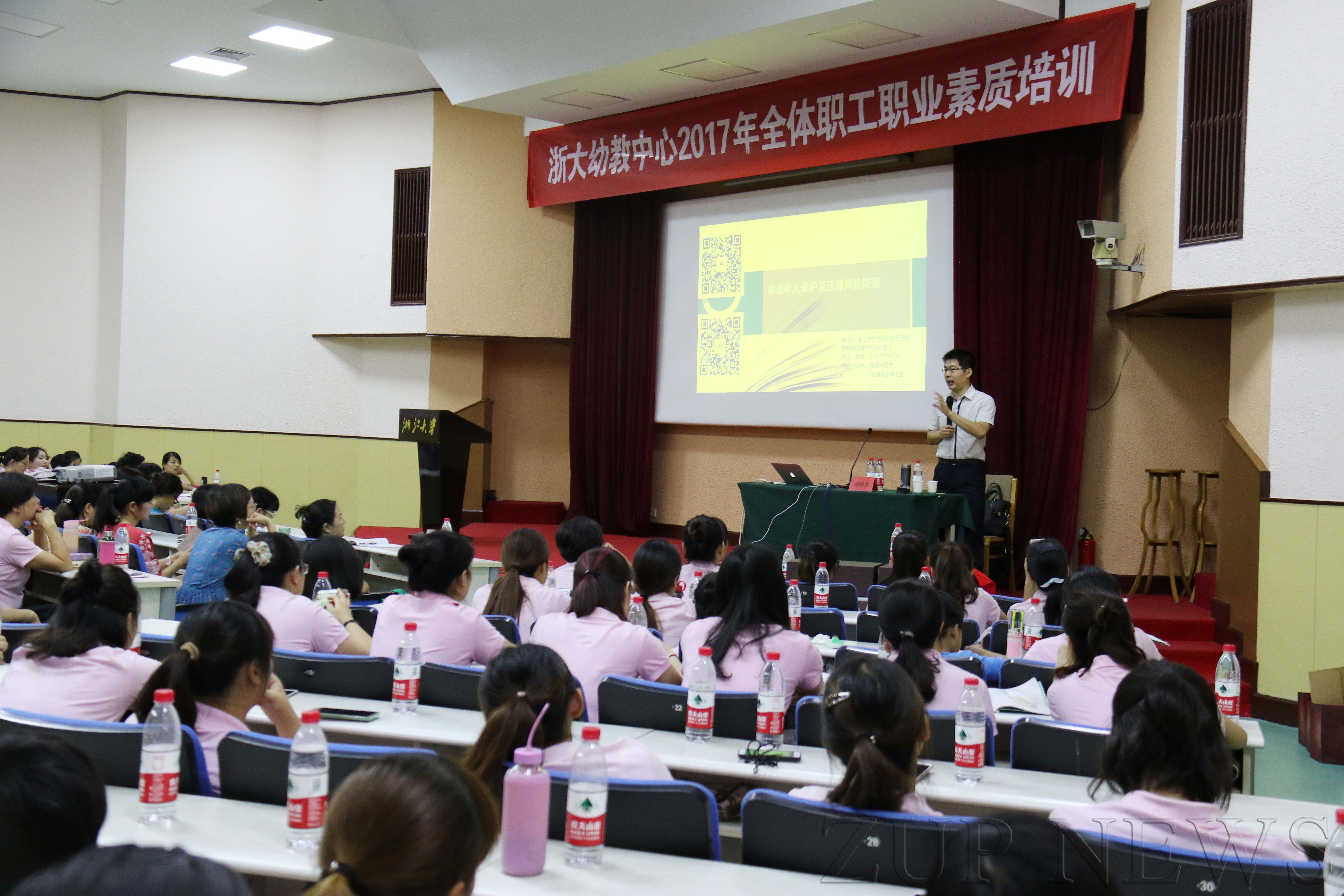 8月30日,幼教中心在浙江大学西溪校区邵科馆召开2017全体教职工职业素质培训暨新学期工作动员会,力邀浙江大学光华法学院副教授、刑法所执行所长、互联网法律研究中心主任高艳东老师来园作专题讲座;隆重表彰了在2016学年绩效考核中涌现出来的先进集体和个人;中心主任张谷乐老师就上学期工作进行了总结,并对新学期工作作了动员。中心领导班子及全体职工近300多人参加会议,会议由中心副主任周熔主持。