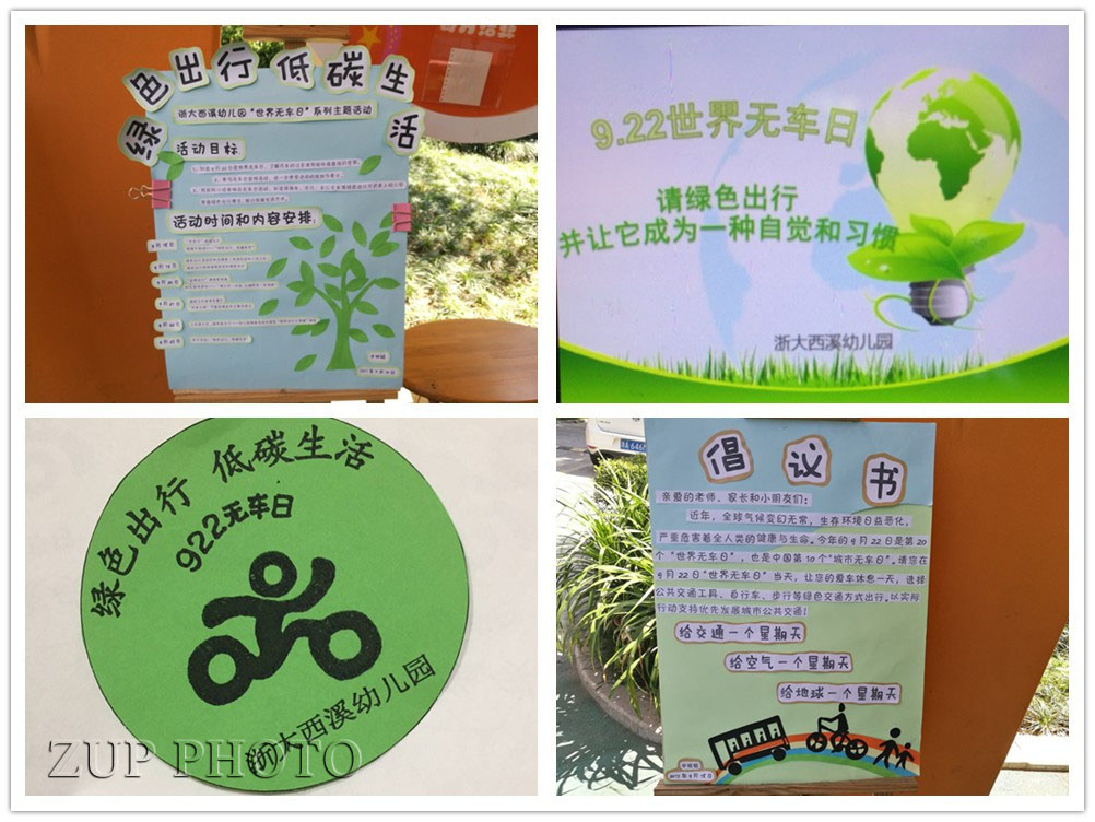 9月18日,浙大西溪幼儿园无车日宣传活动拉开了序幕。活动以老师们自己拍摄和制作的无车日公益片为引子,呼吁大家用实际行动减少大气污染、改善城市的环境。请大家多走路,骑单车,少开车,坐公交,坐地铁,绿色出行。这不仅可以让自己涌入大自然,看看身边人来人往和我们热爱的城市;还可以锻炼身体,保护环境。所以,浙大西溪幼儿园的老师,家长和小朋友用自己的行动和对这个城市及幼儿园的热爱,一起手拉手在国旗下倡议:“绿色出行,你我同行。”