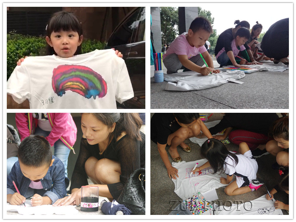在创意T恤绘画活动中,孩子们从自己的视角画出对“无车日”的理解与期待,画作里有蓝天、 绿树、彩虹,有未来世界的太阳能汽车、自行车, 更是有小朋友针对自己的作品即兴创作儿歌一首:“太阳咪咪笑,气球飘飘摇,大树挥挥手,我们骑车出行,快乐伴我行!”