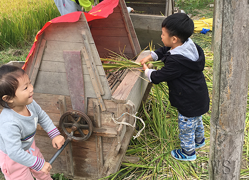 小朋友们穿上雨鞋,像小青蛙一样纷纷跳入田间。爸爸们领来了镰刀,快速地进入了“战斗”模式。镰刀不停地挥舞,稻穗被整整齐齐地割了下来。小朋友们当起了搬运工,把一捆捆稻穗送到田埂上。接下来,大家把割下来的稻穗运到一个专门打稻谷的“木头盒子”里,一边摇动转盘,一边手持稻穗,把稻谷打下来。妈妈说:“小米粒就躺在这些小小的稻谷里,稻谷还要经过一个特殊的机器,小米粒才生出来呢。”“哦!原来我们吃的香喷喷的米饭是农民伯伯用这么多心血换来的。”听了妈妈讲的话,小宝贝们似乎明白了,连连点头,“妈妈,我要好好吃饭!”