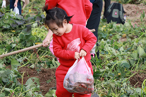 小朋友们和爸爸妈妈一起兴致勃勃地找起了地瓜。不一会儿,地瓜在小朋友们的“火眼金睛”下一个不落地被找了出来,装满了每个人的口袋,我们的地瓜大丰收啦!“今天晚上让外公给我们烧地瓜吃吧!”看来,小朋友们迫不及待地想尝一尝自己的劳动成果了。