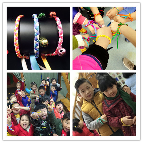 绚丽的彩带,寓意着多彩的未来,彩带交叉缠绕编出手环更代表着对美好生活的追求和向往,铃铛悦耳,传递着幸福和喜悦。孩子们认真的编出三股花绳,并将编绳的方法教给弟弟妹妹们,在分享自己的收获中,也将美好的祝福传递给他们。寓意满满的手环编好了,孩子们戴着自己编织的多彩手环,幸福感油然而生!在编织中,孩子们学会了分享和交流,也在互帮互助中感受到交往合作的喜悦,一个个手环,是收获也是成长!