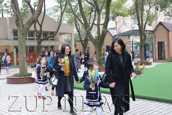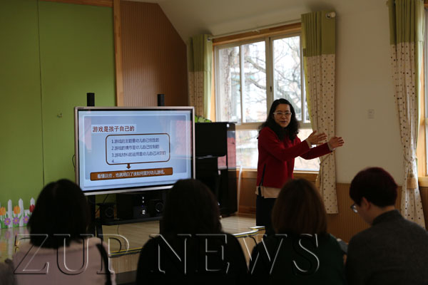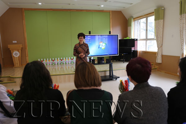 香港客人们一到园门口就受到了大班“小小接待员们”的热烈欢迎,小接待员们用熟练的英语向客人们打招呼,并送上自己精心制作的花束礼物,然后手拉手指引着客人们来到实验园三楼音乐厅。首先,周熔主任向客人介绍了浙大幼儿园的办园理念、教育特色,为客人们举行了热烈而简短的欢迎仪式。接着,中心教科室主任何黎明老师为大家作了题为《读懂儿童——一百种对话的基础》的学术报告,通过讲解“包包子”等游戏案例,提出一名专业的教师应该“秉承专业的态度和观点”,“彰显儿童主体的教育理念”,“回到教育的元素中去”等前瞻的教育理念,并和客人们在现场进行了互动。然后,实验园骨干教师陈雨濛展示了大班语言前阅读活动《变焦》现场教学。最后,客人们走进玉泉园、实验园进行了现场参观学习,感受浙大幼儿园的办园特色和文化氛围。玉泉园跨年龄的户外自主游戏开展,丰富的科学探究环境,实验园开放、自主、专业的混龄工作室活动,都让客人们印象非常深刻。