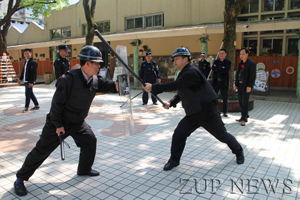 接着两园又进行了防恐防暴演习,校保卫办陈主任对一些防护技巧进行了耐心的讲解,对防暴工具的正确使用进行了详细的现场指导,最后使得保安人员成功制服“歹徒”。