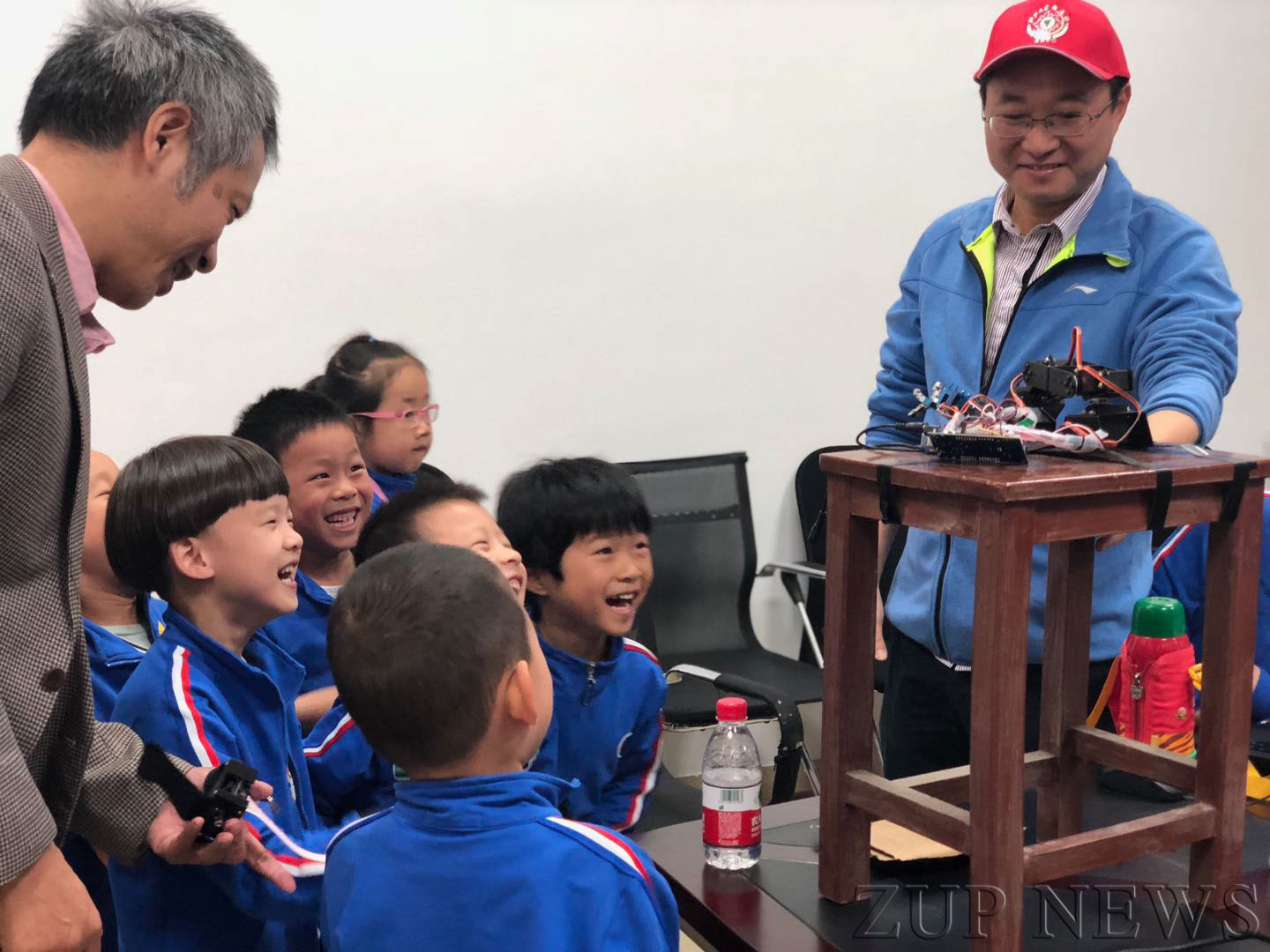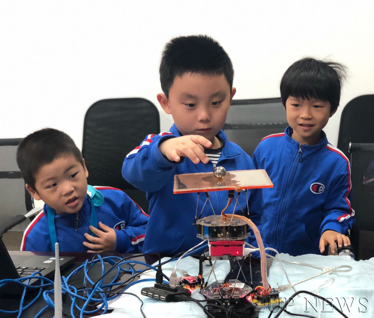 孩子们一路欢歌笑语,兴致勃勃地来到了航空肮天学院和机械工程学院等实验室,面对这些科研专利产品,孩子们喜出望外、探本溯源,在教授老师的指导下跃跃欲试。能够打印出玩具的3D打印机、远程控制的机械臂、神奇的记忆弹簧……都成了孩子们心中的神秘发现,特别是平衡球的实验,深深吸引孩子们眼球,实验台上放置着一台颜色鲜艳、造型别致的仪器,仪器的上部是一透明的塑料薄片,塑料片的中央稳稳地停着一只小铁球。浙江大学应用力学所的罗银淼老师开始演示实验,他灵巧地用手指轻轻拨动小球,小球发生滚动,眼看就要越过塑料薄片边界掉下去了,可小球像是知道前面是“悬崖”,竟能够神奇的折回到薄片中央。小朋友的注意力一下子就被吸引了,对这个实验产生了浓厚的兴趣。罗老师反复了几次,小球总是能悬崖勒马,回复原地。“这是怎么回事呢?”罗老师循循善诱地问大家。小朋友立刻叽叽喳喳地议论开了。经过罗老师的解释,大家才恍然大悟。原来平板有个感应装置,能够探测到小球的位置,只要小球越过薄片的某一区域,薄片就会发生摆动,引起小球向薄片中央滚动。演示实验结束后,小朋友都自告奋勇,亲手尝试制作实验。
