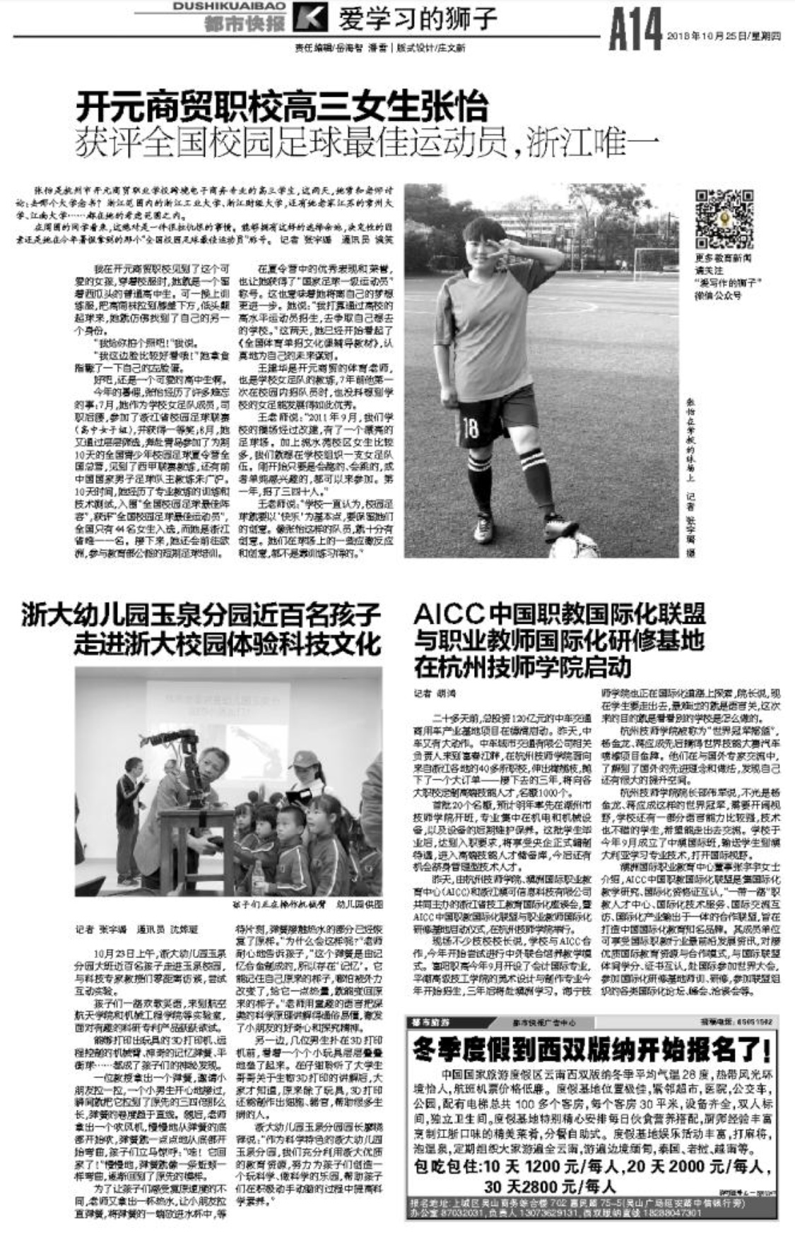 一个个神奇的实验触手可及,小朋友们积极参与、乐在其中。本次亲历体验,让原本抽象枯燥的科学实验变得生动有趣,有效地激发了小朋友对科学活动兴趣和探索热情,开拓了孩子们的视野,也进一步培养了对科学孜孜不倦的精神。作为科学特色的浙大幼儿园玉泉分园,充分利用浙大优质的教育资源,努力为孩子们创造一个个玩科学、做科学的乐园,孩子们在积极动手动脑中提高科学素养。本次活动,得到了新闻媒体的全程关注,并发表于10月25日的都市快报。