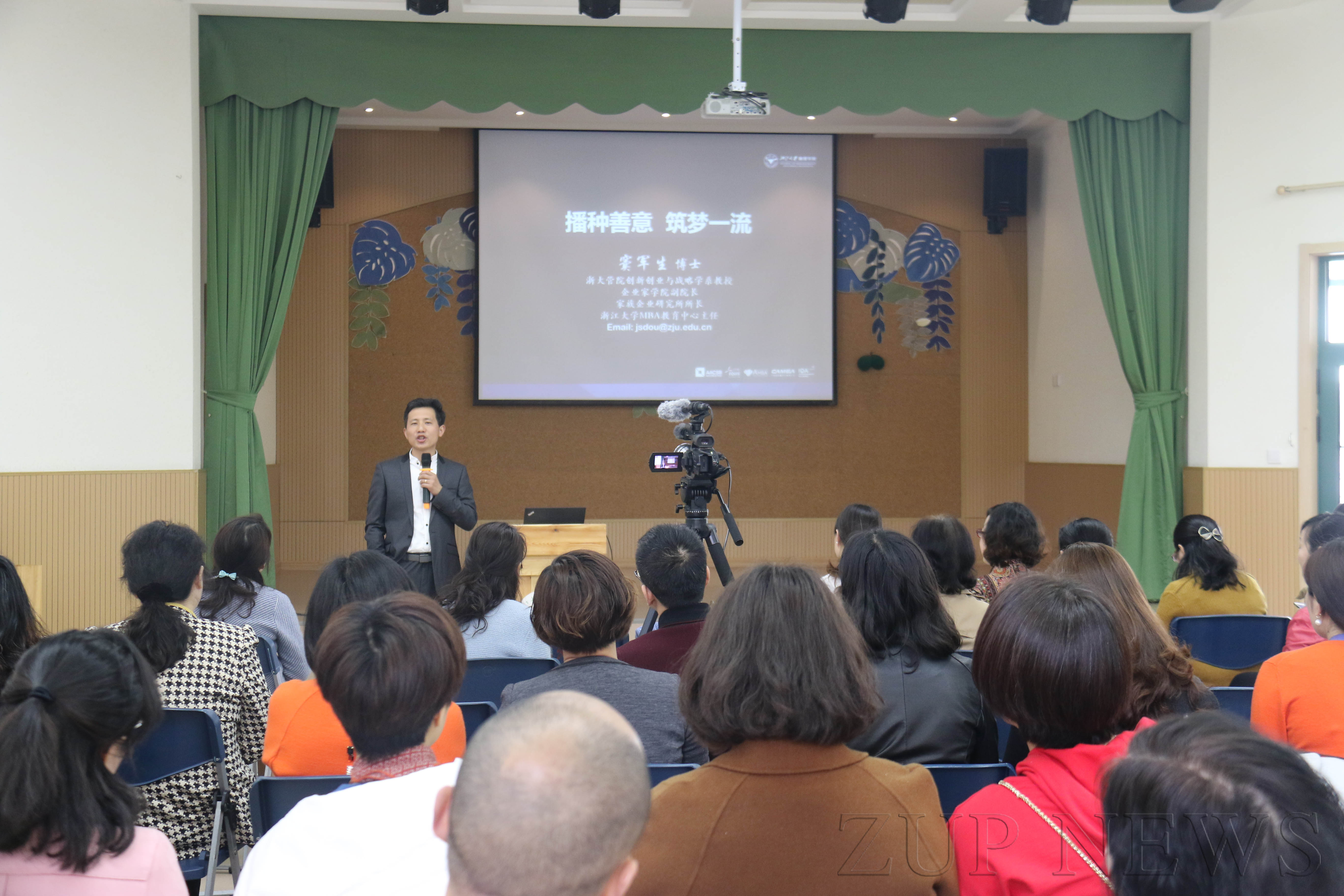2019年4月16日下午,幼教中心在玉泉分园音乐厅举行管理干部学习会扩大会议,特邀浙江大学管理学院创新创业与战略学系窦军生教授来园主讲现代教育管理专题报告。幼教中心管理干部、骨干教师近70人参加了会议。