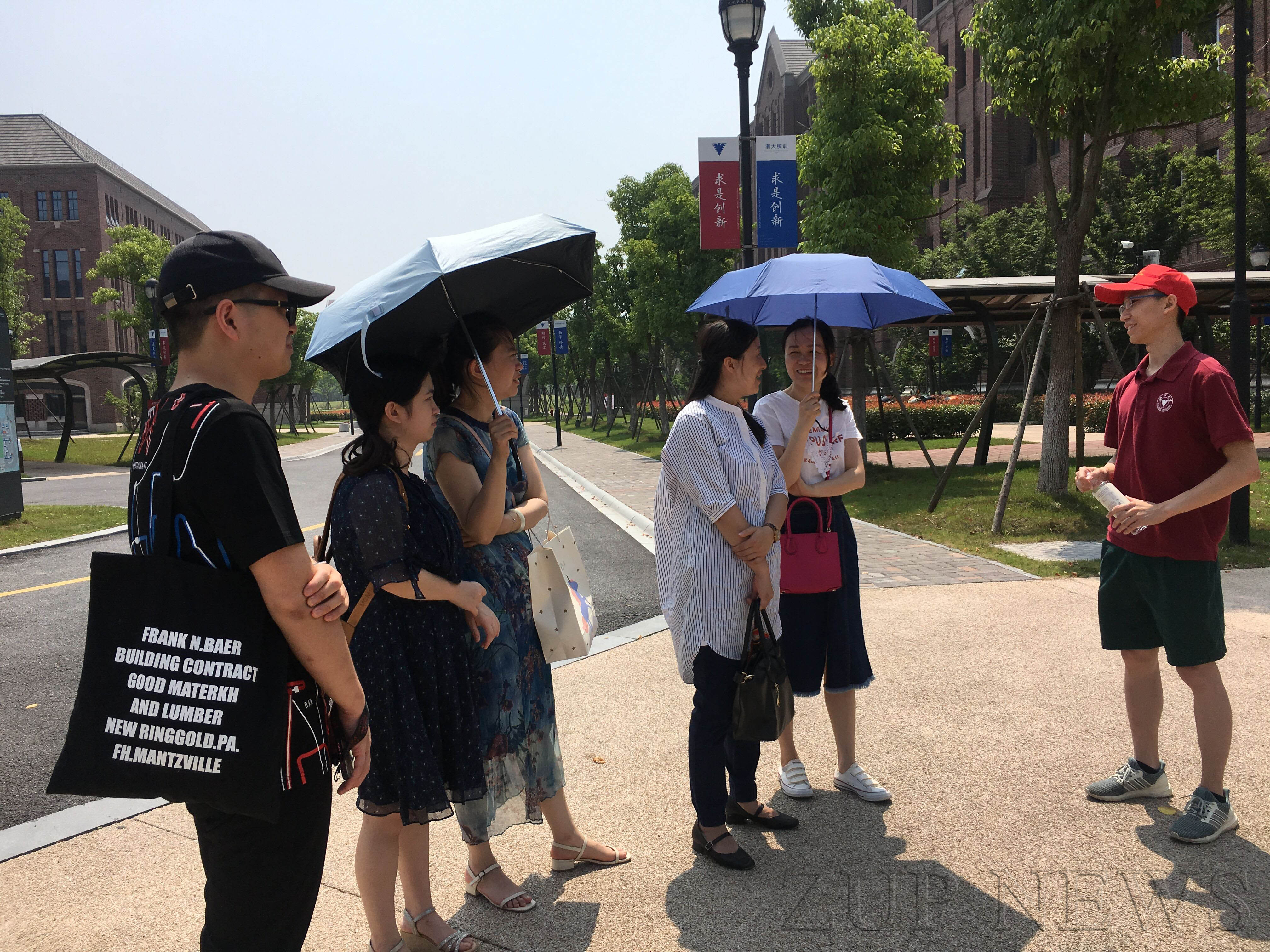 参观当日,正逢海宁校区进行三位一体考试,校园里随处可见带孩子们来参加考试的家长,家长们不断拍照留影、感叹校区的美丽。期间,还偶遇了头戴“小红帽”的学生志愿者。志愿者告诉大家国际学院招收的都是各地成绩名列前茅的学子,学院师资雄厚,融合了国际双聘教师、浙大双聘教师与科研人员,拥有着一流的教育资源。