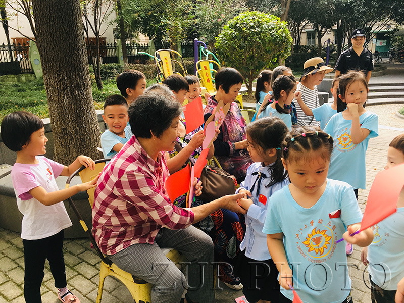 心动不如行动,9月30日,在玉泉分园园长助理梁冰的带领下,大班部分小朋友带上亲手制作的爱心贺卡,走进求是社区,为社区的爷爷奶奶们送上诚挚的祝福。小朋友们为爷爷奶奶们表演了《我和奶奶去买菜》、《爷爷教我打月饼》两首歌曲,令在座的老人们不禁回想童年的快乐时光以及一家人几代同堂、其乐融融的画面。