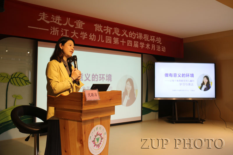 本次学术月首场活动由浙江省特级教师、西湖区学前教育指导中心教研员沈颖洁带来主题报告《做有意义的环境——让每个角落都支持儿童的学习与表达》。
