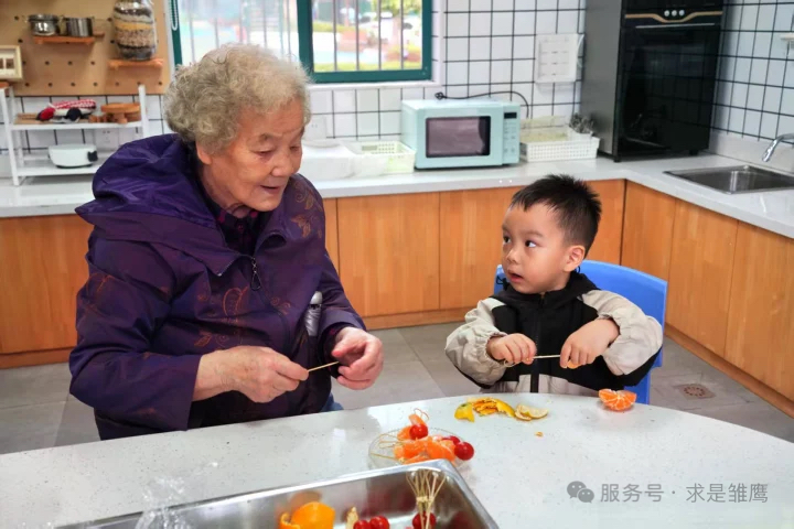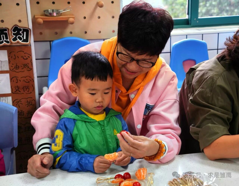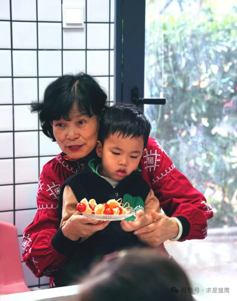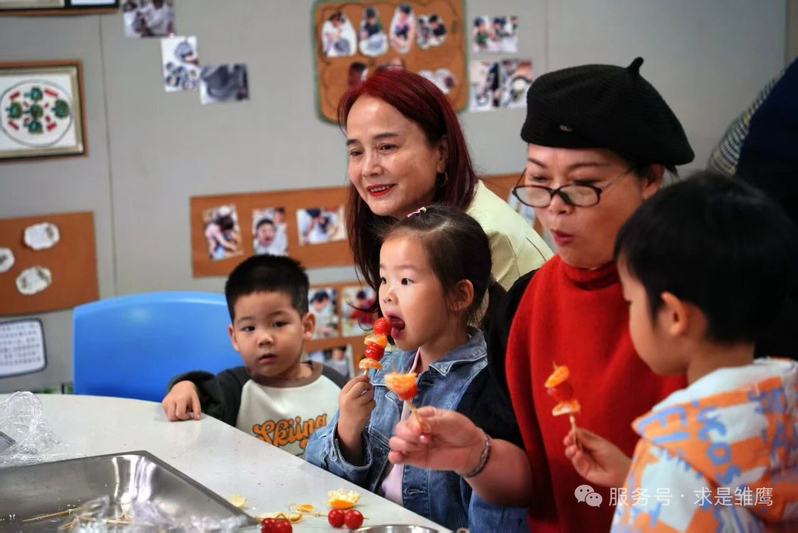 大家移步至小厨房,共同参与“甜蜜糖葫芦”的制作。在老师的讲解与退休教师的耐心帮助下,孩子们小心翼翼地用竹签串起五彩的水果,学习如何搭配颜色、如何串得牢固,奶奶们手把手地教,眼里满是慈爱与专注。熬糖、浇糖……在老师的协助下,一串串晶莹剔透的糖葫芦陆续完成。孩子们与退休教师一起品尝这份亲手制作的甜蜜,笑容如糖葫芦般甜入心底。活动尾声,退休教师们享用了温馨的餐点,继续在园中畅谈往事,感受“家”的温暖。