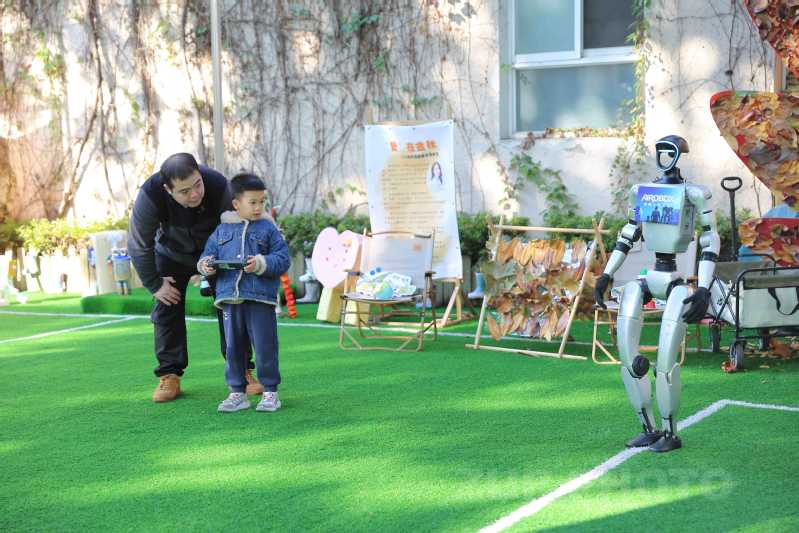 首先,孙叔叔向孩子们展示了机器人的基本能力,当机器人做出蹲下、躺下的动作时,孩子们睁大眼睛,发出阵阵惊叹。“它有50多个关节,比我们的关节还灵活!”孙叔叔的讲解让孩子们对机器人的构造有了初步认识。